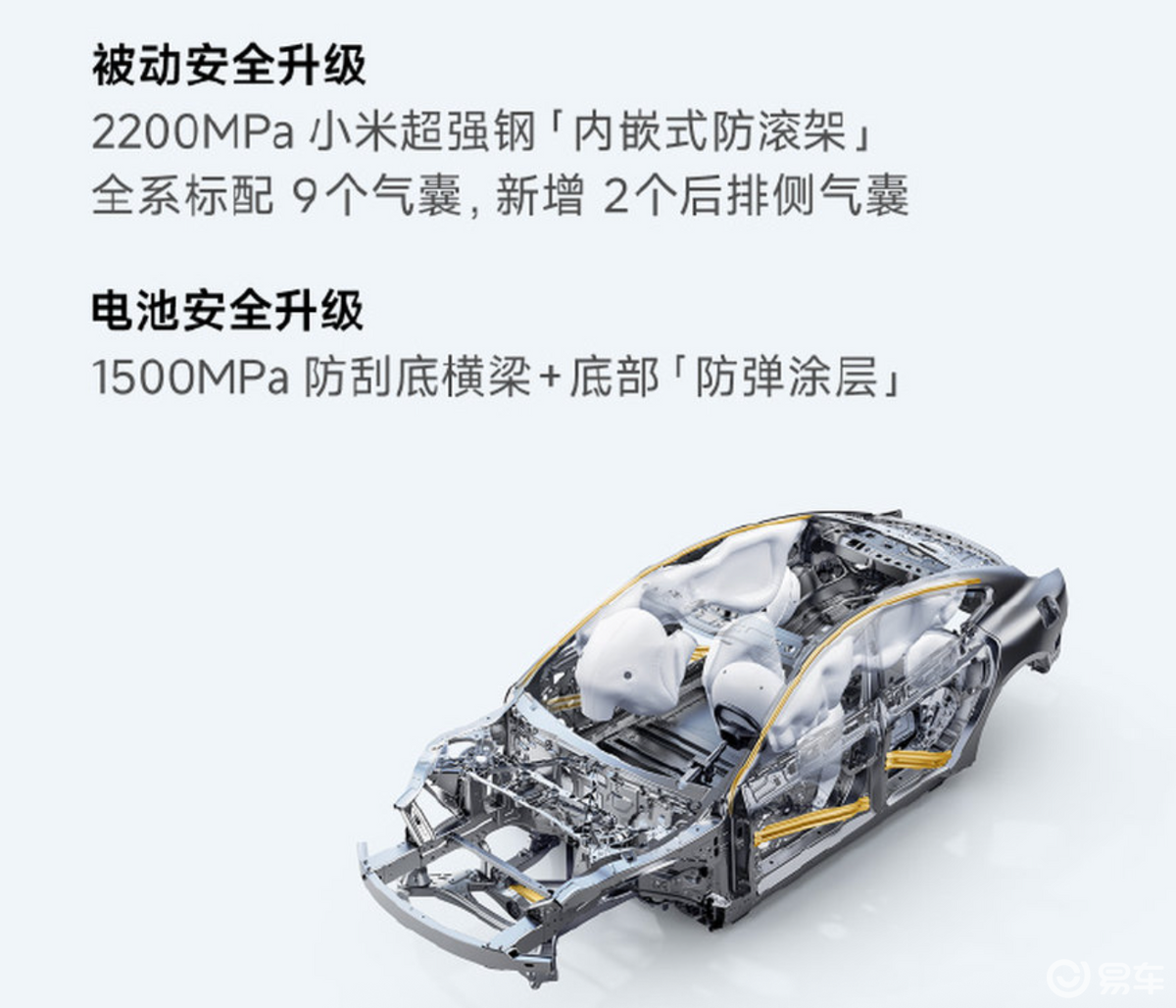 安全升级,采用2200Mpa小米超强钢内嵌式防滚架,全系标配9气囊,新增2个后排侧气囊。电池安全方面升级1500Mpa防刮底横梁+底部防弹涂层。