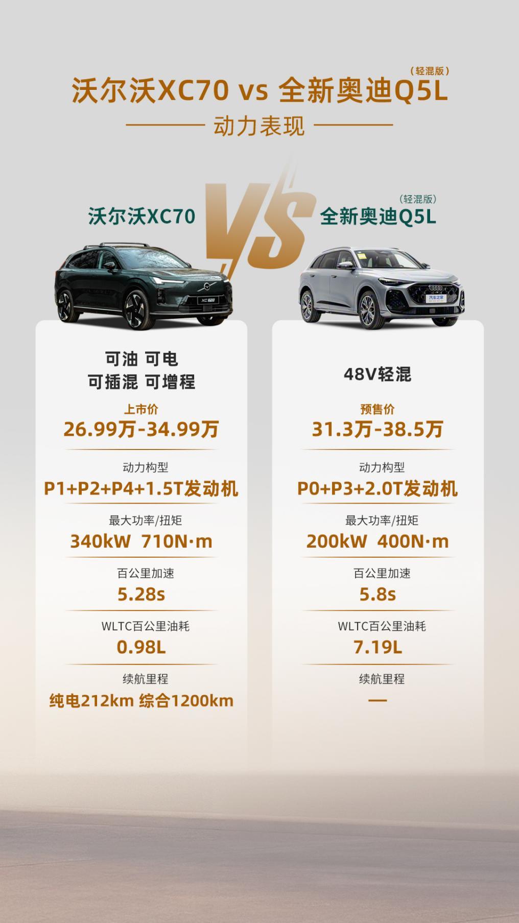 而全新XC70基于全新SMA架构打造,它采用混动专用发动机+总功率263kW双电机,零百加速仅需5.3s,日常红绿灯起步和高速超车,更加轻松自如,而且全新XC70的CLTC纯电续航超200km,日常上下班和周末郊游,完全可以当纯电车开,省心省钱;跑长途的话,它超1200km的综合续航,也能覆盖大部分用车场景,因为可油可电,跑长途也比全新Q5L省钱。