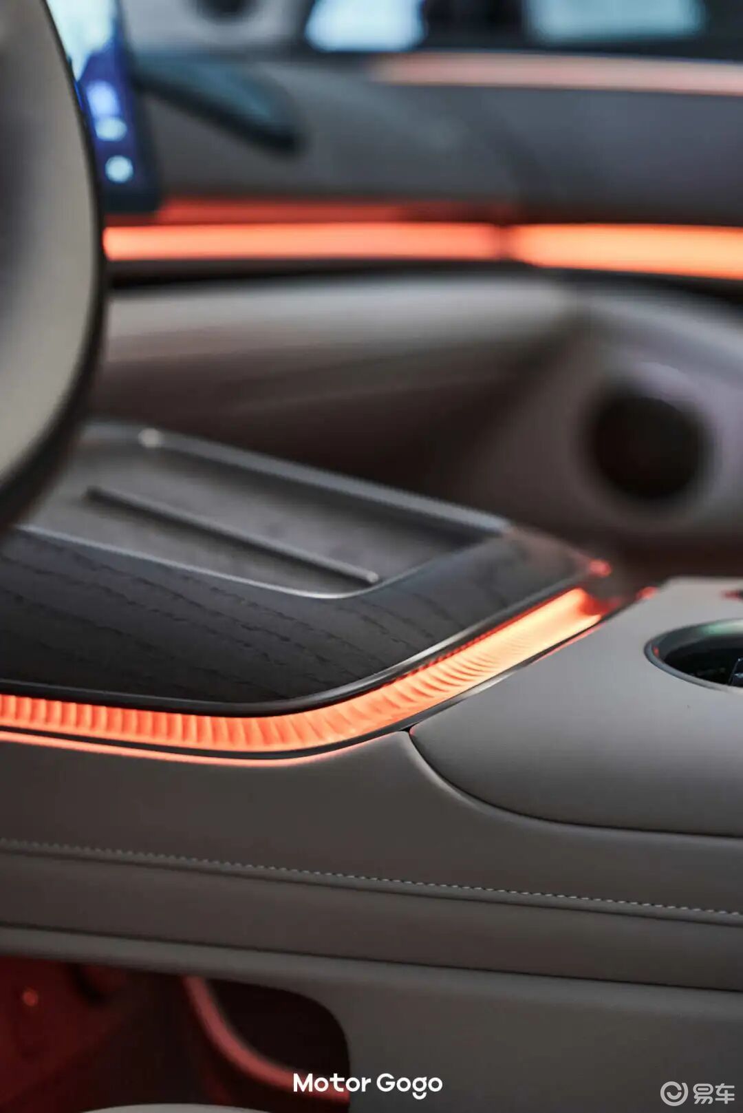 中控台也是非常简洁的大横屏布局,用料上很讲究,中控台上方是大面积的翻毛皮材质,两侧门板上则基本上都是皮质覆盖。