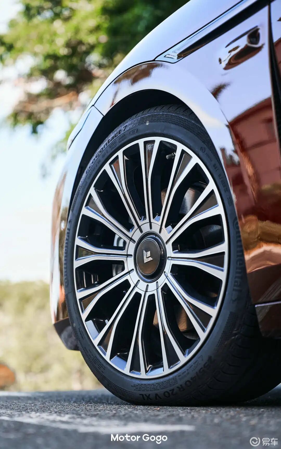 轮毂也搭载了悬浮式 LOGO,而且提供两款轮毂可选,标配的 20 寸 12 幅涡式轮毂显高端,另一款 7 孔碟式轮毂就显得很尊贵了。