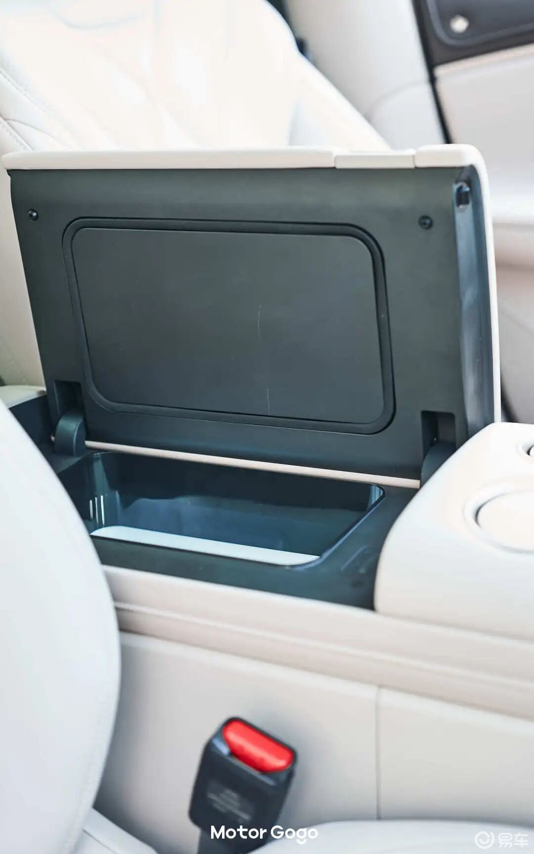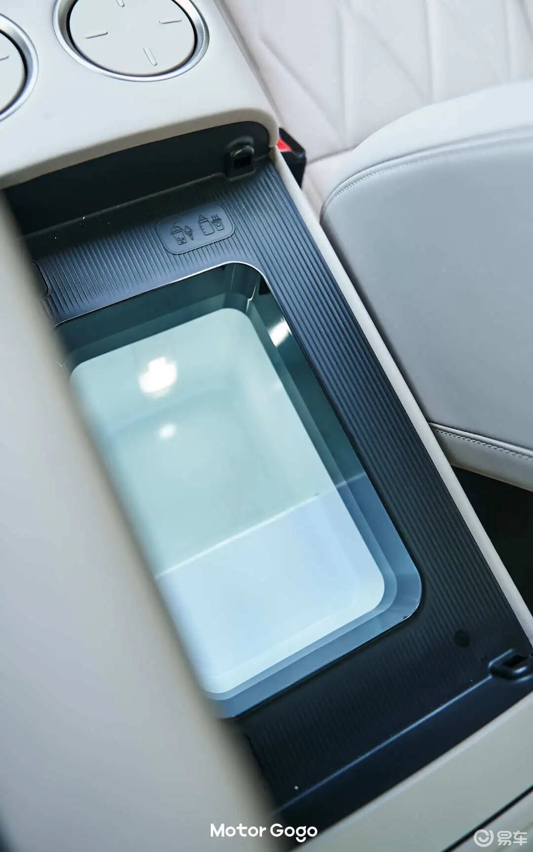 冰箱设置在前排座椅中间,采用单侧式翻盖设计,而且是向副驾侧翻开,还是有些不太方便的。
