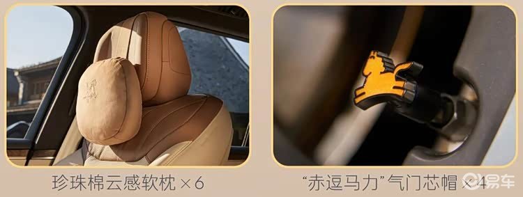车内采用六座布局,重点强调家庭使用场景,车内采用了棕米双色的Nappa真皮内饰。前排头枕上绣有“马到成功”字样,方向盘饰条和车机系统界面也更新为专属主题风格,车辆还新增了马啸声效作为锁车提示音。