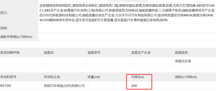 新车共申报了三种动力类型,其中单电机版本分别搭载峰值功率为240千瓦和245千瓦驱动电机。