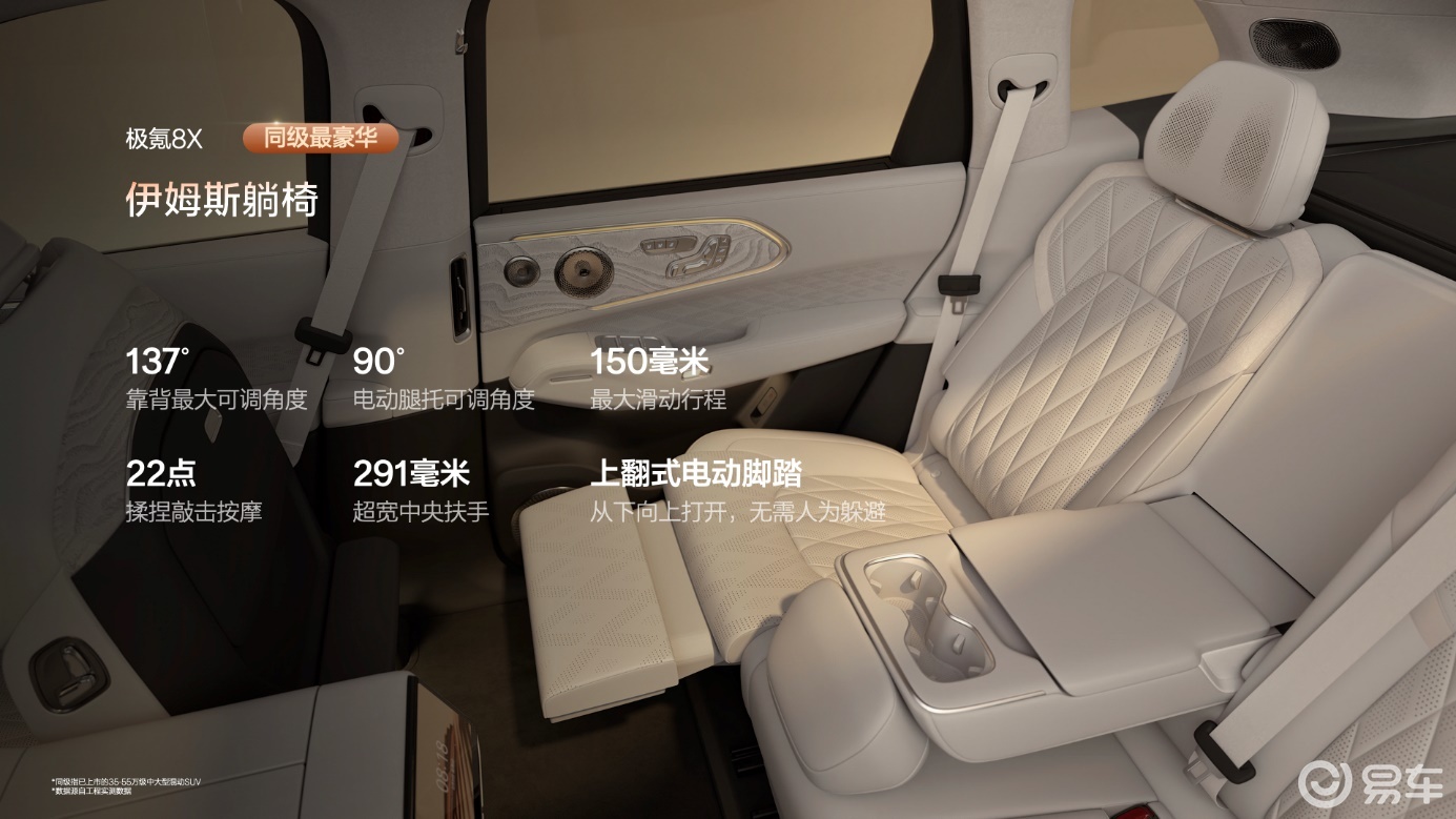 从对标来看,极氪8X不仅是在动力、超控上配齐,还在乘坐舒适性下足了功夫。首先二排伊姆斯躺椅继续在8系上出现。二排137°的靠背最大调节角度、90°电动腿托、大五座最长150毫米滑动距离以及吸顶屏等,都让8X的尊贵彰显。
