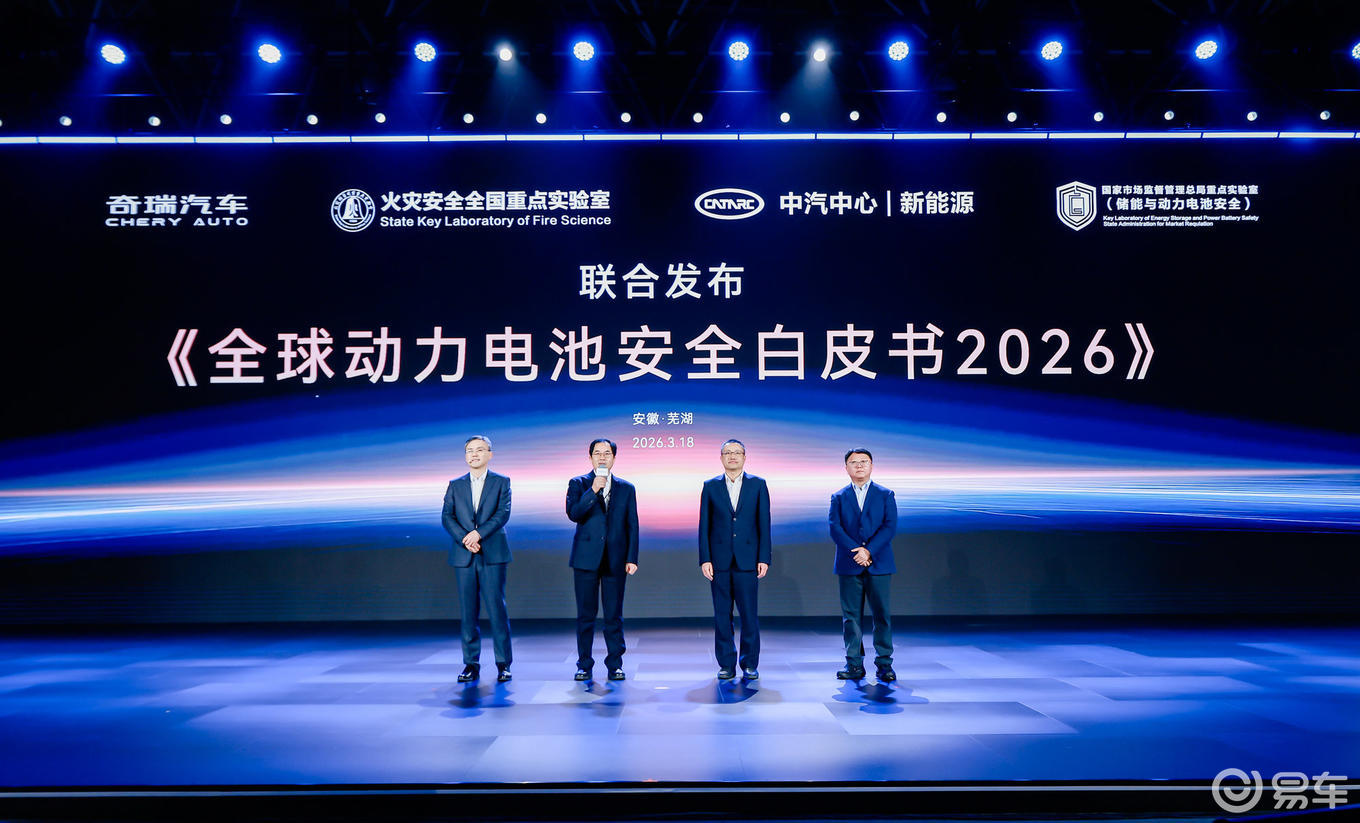 活动现场,奇瑞还携手火灾安全全国重点实验室、中汽中心丨新能源、国家市场监督管理总局重点实验室(储能与动力电池安全)等机构,联合发布了《全球动力电池安全白皮书2026》。