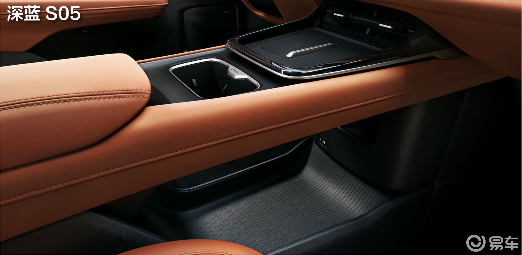 深蓝S05全车共规划有33处储物空间,其中中控台下方镂空位置的空间达到15L,可以存放随身小包或者出去玩的相机等,而中央扶手箱不仅分为上下两层,由于其外壁面采用一体成型空调风道结构,其9.5L的下层空间可以在空调的“帮助”下实现冬天保温、夏天制冷(最低5℃),开车烦躁了随时来杯冷饮还是很惬意的。