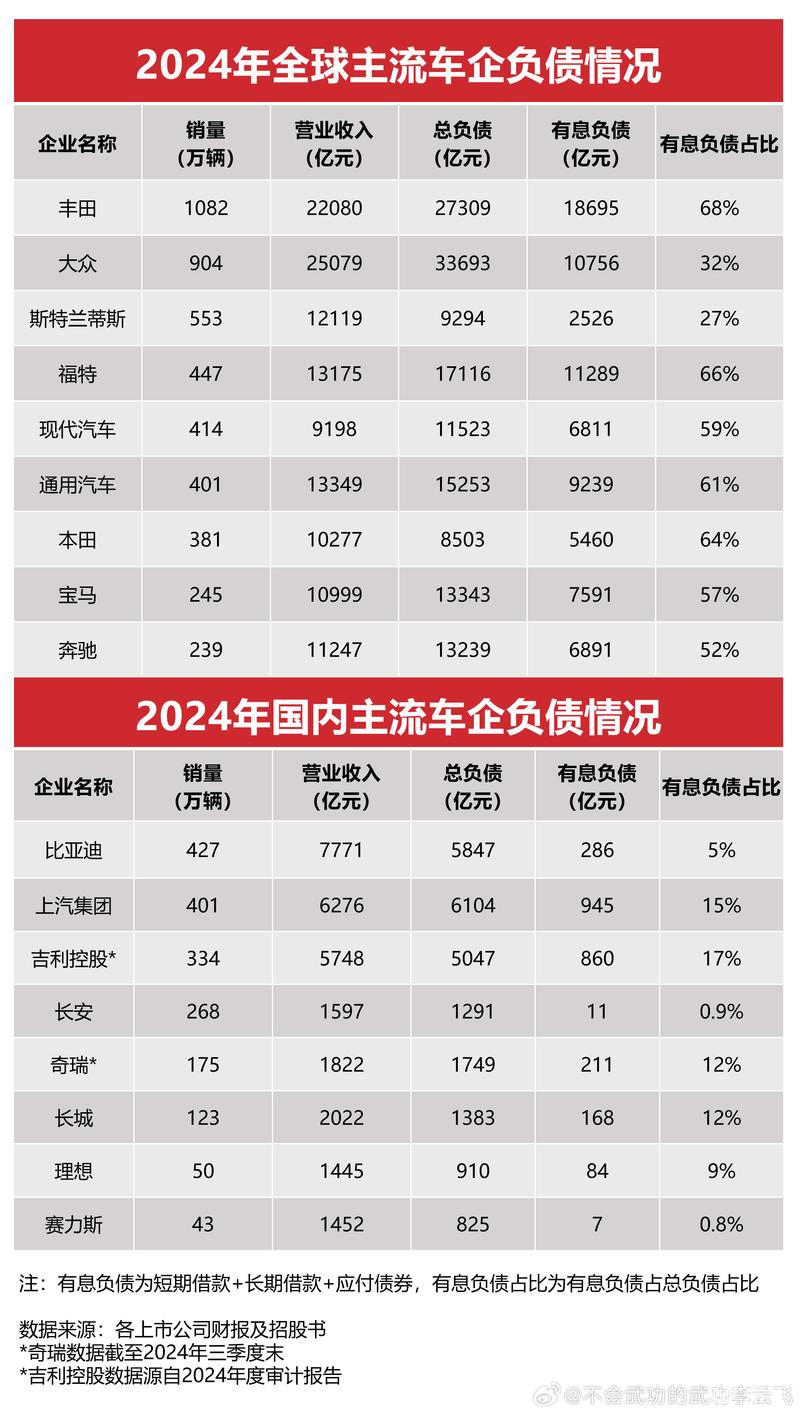 2、拿我们总负债5800多亿说事,很危险!那丰田2.7万亿、大众3.4万亿、福特1.7万亿、吉利5047亿、上汽6104亿,他们危险吗?(图2:2024年上市公司财报信息—负债情况)