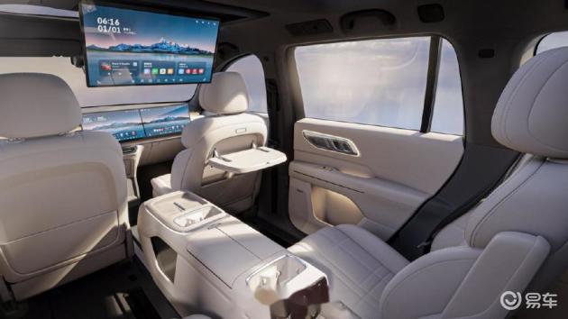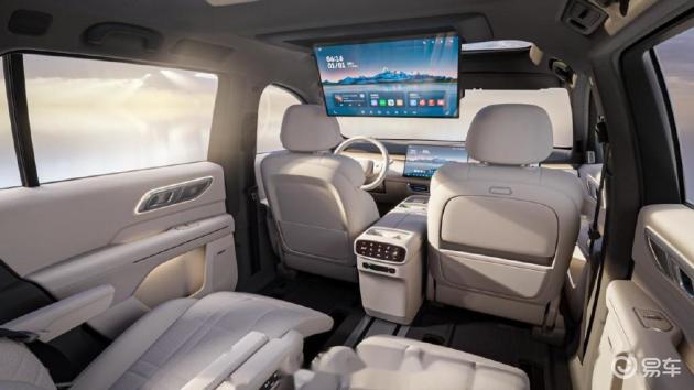 领克900的座舱与深蓝S09大同小异,配备了12.66英寸全液晶仪表和30英寸中控屏,中控屏有一半已经到了副驾位置,加上支持分屏操作,实际上与深蓝S09的主副屏效果基本一致。同样配备了50W充电板、30英寸6K后排娱乐屏,硬件上基本与深蓝S09相差不大。不过没有深蓝S09的创意中岛设计,二排座椅无标配零重力,旋转座椅实用性不高。