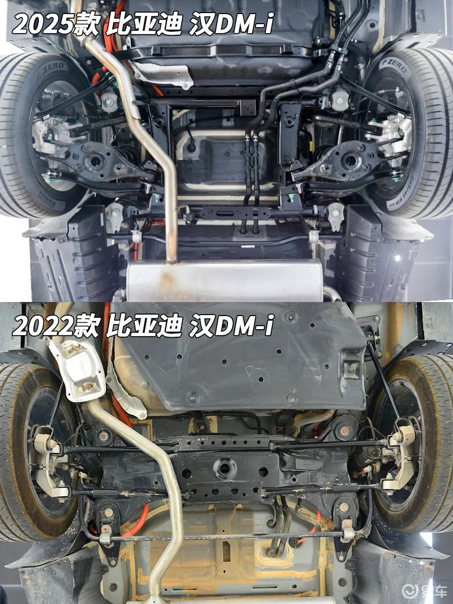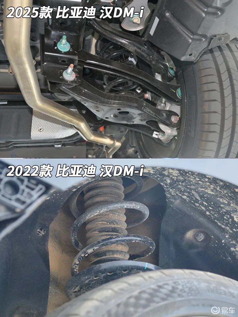 这辆比亚迪汉DM-i的底盘相比老款,有不小的升级,一体式后副车架变成了全框结构,原先被人诟病的三连杆“筷子”后悬架也升级成了标准的五连杆结构。简直是天翻地覆的变化!终于可以摆脱那些天天说“筷子悬架”的人了。