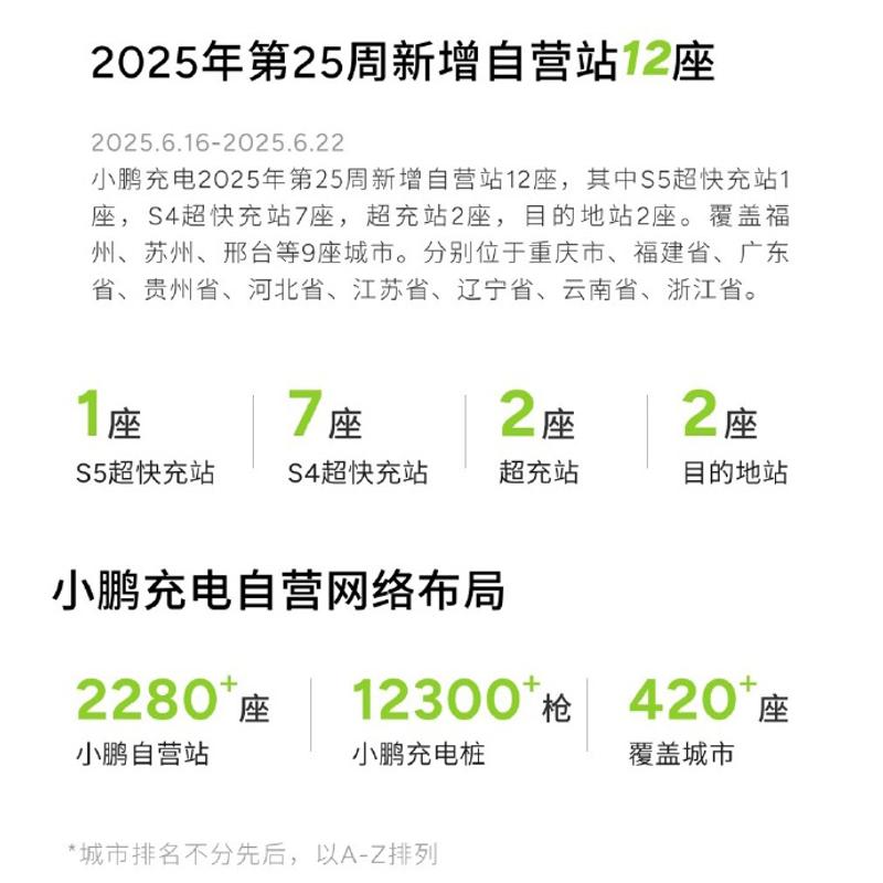 车讯 近日,小鹏汽车官方微博宣布,小鹏充电2025年第25周新增自营站12座,其中S5超快充站1座,S4超快充站7座,超充站2座,目的地站2座。