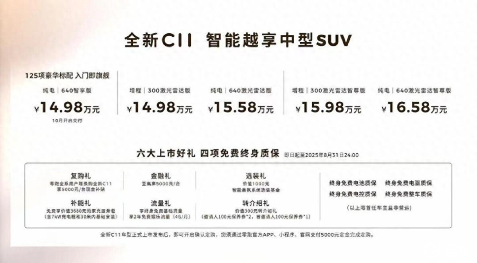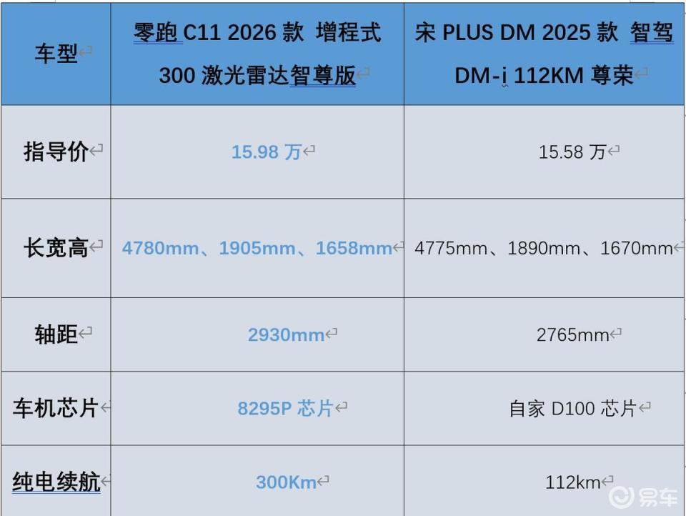 尤其是刚刚上市的全新26款零跑全新C11,在产品力方面再次有了很明显的升级,核心竞争力更加突出,而且新车增配的同时,指导价区间为14.98万—16.98万起,分为五个版本,其中入门版本增程式 300激光雷达版和纯电版 640智享版,都是14.98万起,同时可享受六大上市好礼、四项免费终身质保,价格和优惠政策都拉满了,品价比非常高。今天咱们就拿26款零跑全新C11和宋PLUS做一个对比,来看看,这两款车到底该如何选择?