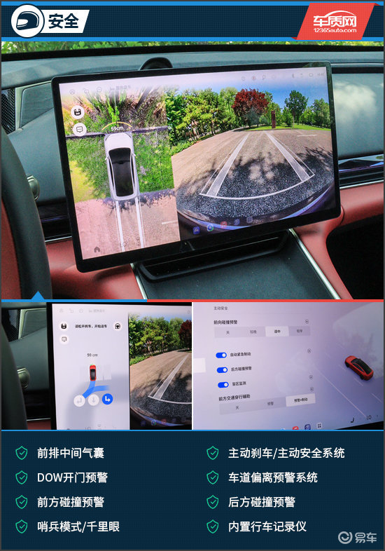 安全方面,评测车拥有丰富的主/被动安全配置,包括车道偏离预警系统、主动刹车/主动安全系统、前方碰撞预警、哨兵模式/千里眼以及内置行车记录仪等。此外,评测车还配备了360度全景影像,整体画质非常清晰,使用体验较好。