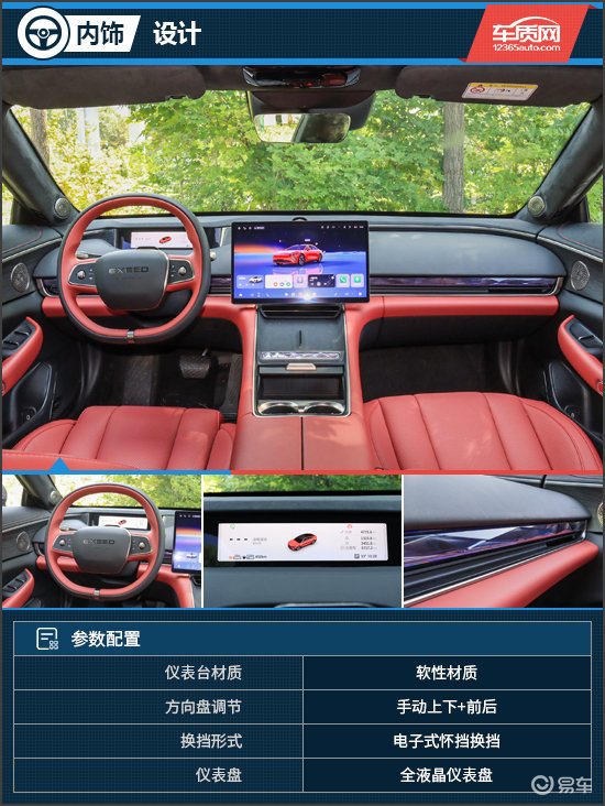 进入车内,整体布局采用环抱式设计,配合8.2英寸液晶仪表、15.6英寸中控屏以及大面积的软性皮质包裹,营造出沉浸且高级的驾乘氛围。同时,中控台采用了长条状的玻璃面板,内部辅以氛围灯,视觉效果相当精致。而中控屏下方巧妙地隐藏了空调出风口,进一步强化了整体的简洁与未来感。