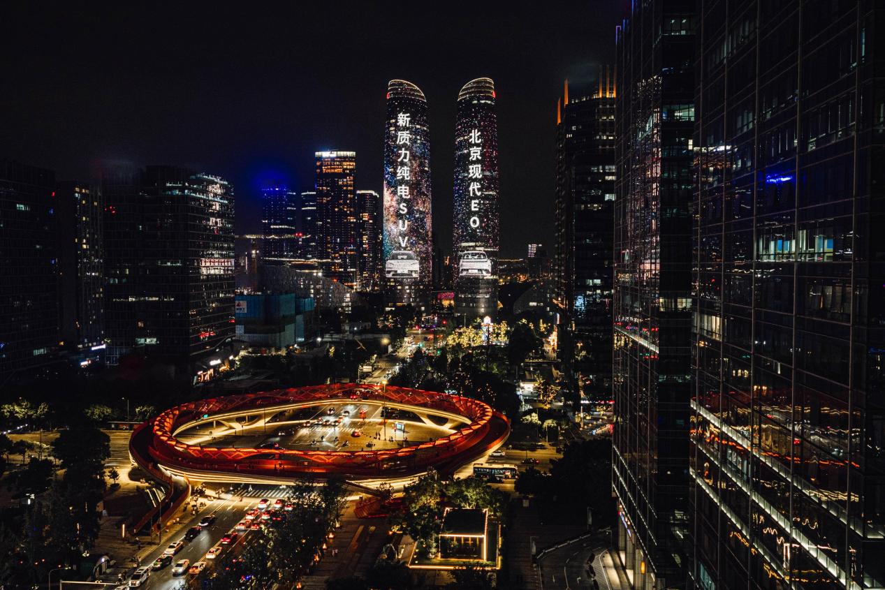 据了解,成都金融城双子塔高220米,以外立面“冰花造型”、全LOW-E中空玻璃幕墙为特色,是成都科技与时尚融合的象征,有着“成都最美天际线”之称。北京现代选择在此为EO(ELEXIO)举办首秀,双子塔的灯光秀与车型所具备的科技感、现代美学高度契合,形成了相互映衬的效果。