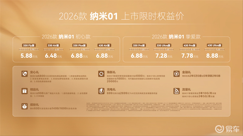 · 2026款纳米01:定位“精致大宝贝”,限时指导价 5.88-8.88万元