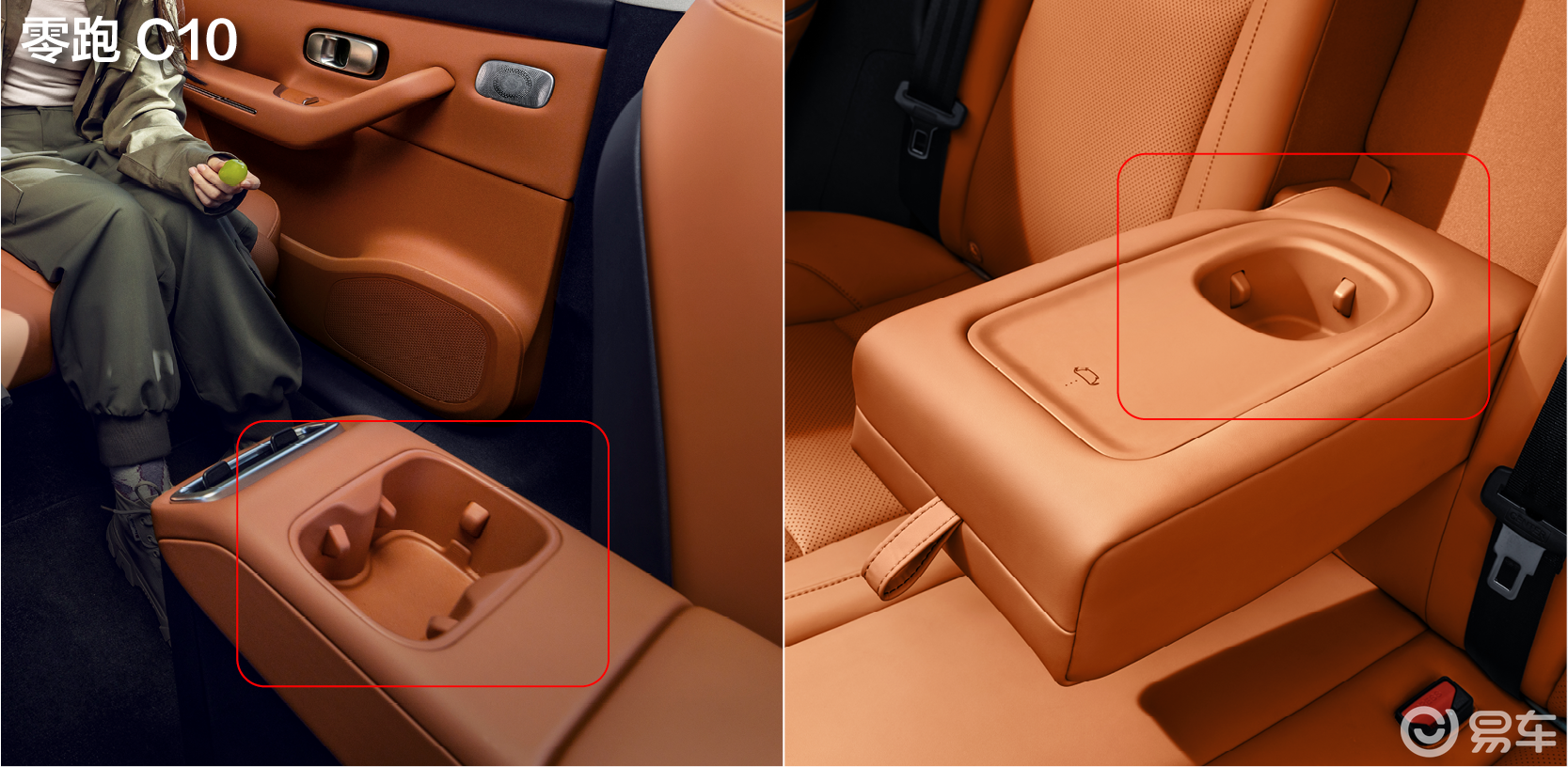 零跑C10全车有26处储物空间,相对少一些,好在日常随身带的东西也都有地儿放。其内部空间上最吸引我的地方有两个:一个是车内设计有5处杯托,即便后排坐满3人也能有2个杯托可用,后排朋友手里的奶茶、咖啡等不用担心没地儿放了。