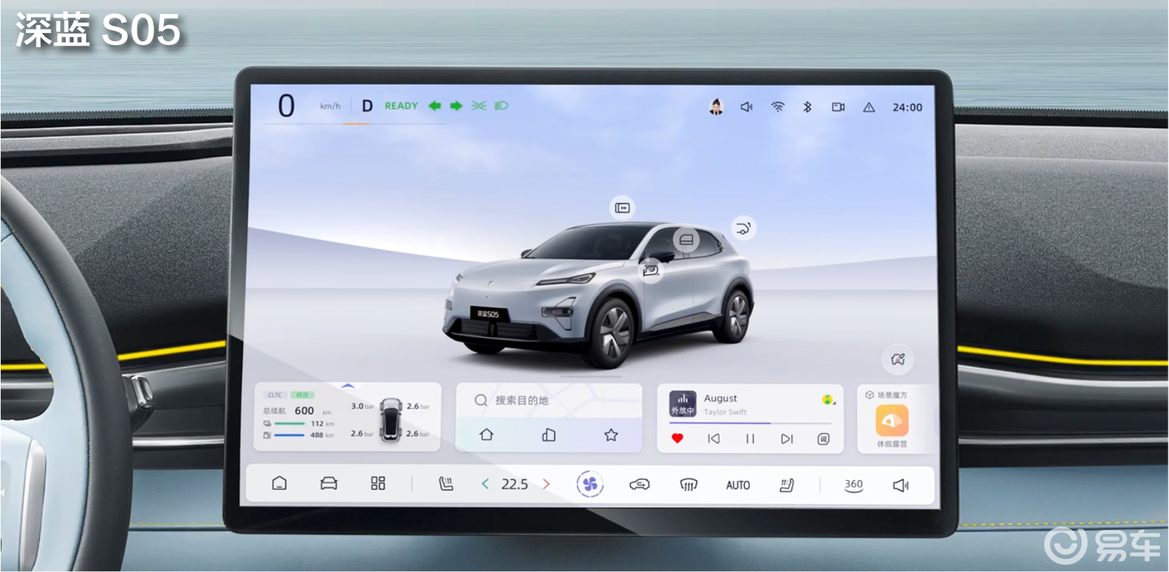 智能座舱方面,深蓝S05配有一块15.4英寸的向日葵屏,支持左右“摇头”方便主副驾查看、手车多元互联(CarLink、T-link、HiCar、荣耀互联)以及微信位置&音乐无感互联,同时带有DeepSeek R1深度思考大模型,能随时解决好奇宝宝的各种问题。