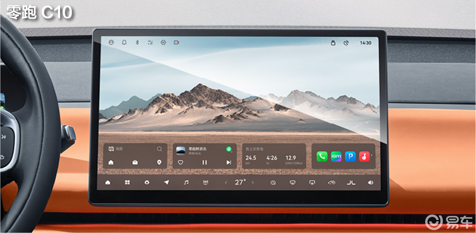 零跑C10则配备一块14.6英寸中控屏,尺寸稍小且不能左右旋转,3D车模随不同菜单“一镜到底”变化的设计挺炫酷。这款车同样搭载有AI语音大模型,DeepSeek+通义千问,且支持华为/小米/oppo/vivo等手机互联以及HUAWEI HiCar4.0+ICCOA Carlink2.0(安卓15及以上)投屏生态。