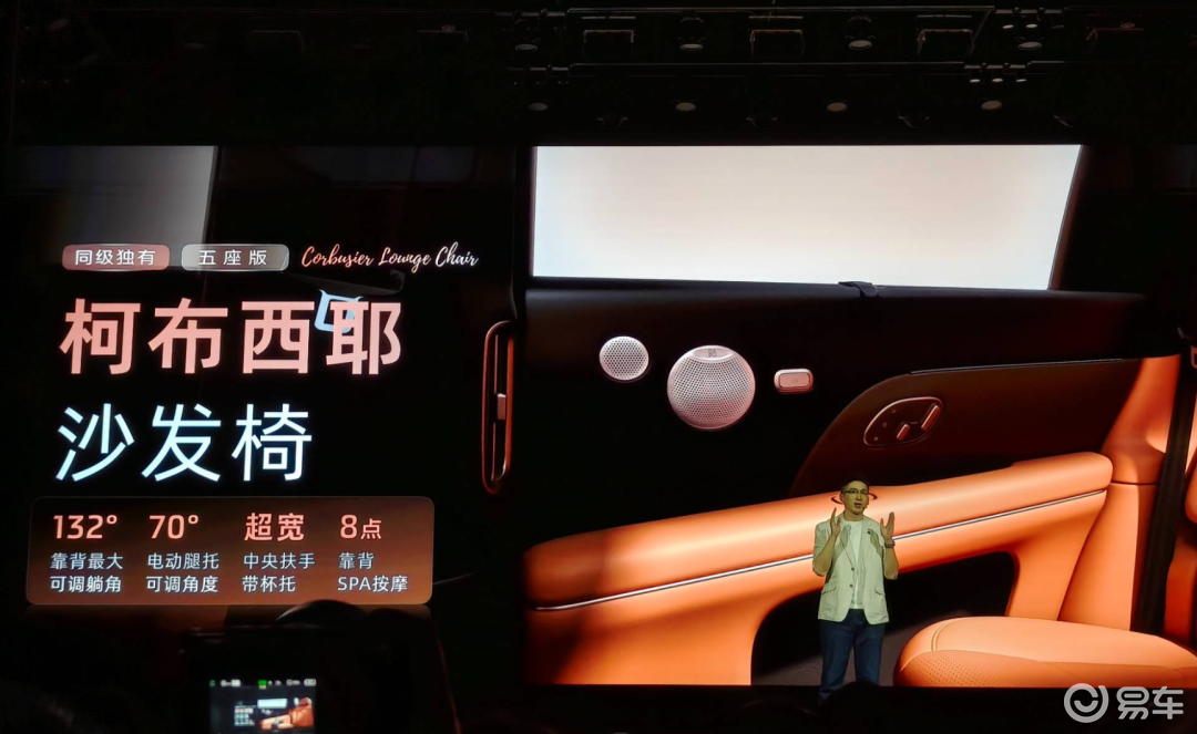 五座车型还配有智己专属打造的「柯布西耶」沙发椅(位于二排右座)。最多可将靠背角度调节至 132°,还配有最多 70° 调节的电动腿托、带杯托的中央扶手和 8 点 SPA 座椅按摩功能,光看数据已经可以推断,其乘坐体验会在当下流行的「零重力座椅」之上。