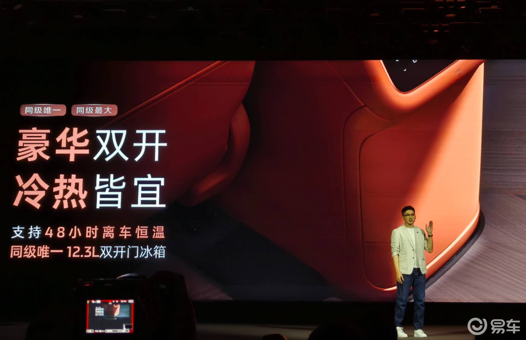 其他配置方面,车内有一个 12.3L 的双开门冰箱,离车 48 小时温度依然保持不变;座椅材质是 IM Nappa DELUXE 臻奢⾼定头层真皮,豪华氛围的打造也是颇下功夫。