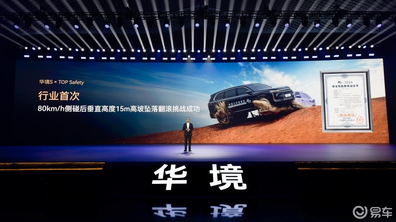 安全性方面,新车在主/被动安全领域均下了大功夫。除了全系标配华为乾崑全维防碰撞系统CAS 4.0以外,其还与宝钢合作,在关键位置采用2000MPa热成型钢,还设计了独特的一体式热成形前地板骨架以及一体式热成形双门环,具备坚固的车身核心骨架。同时,新车还搭载双腔体远端气囊,更好的保护车内乘员在碰撞中的安全。发布会上官方也宣布华境S已经通过了“80km/h侧碰后15m高坡坠落翻滚”挑战,并获得中汽品科TOP Safety安全性能挑战证书。