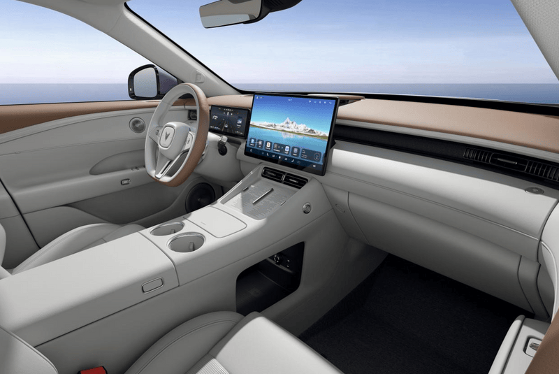 内饰方面,新车采用了“浮光岛屿”视觉风格和沉浸式五感的体验设计,搭载15.6英寸中控大屏幕,鸿蒙座舱HarmonySpace 5拥有出色的自然交互能力,可实现五屏联动。并推出三款全新内饰颜色,分别是琥珀棕、深海蓝 、极光紫。采用了环保式座舱设计,营造出温馨的驾乘感。此外,中控采用了“T”字形布局,屏幕下方为空调出风口,和两个手机无线充电面板。
