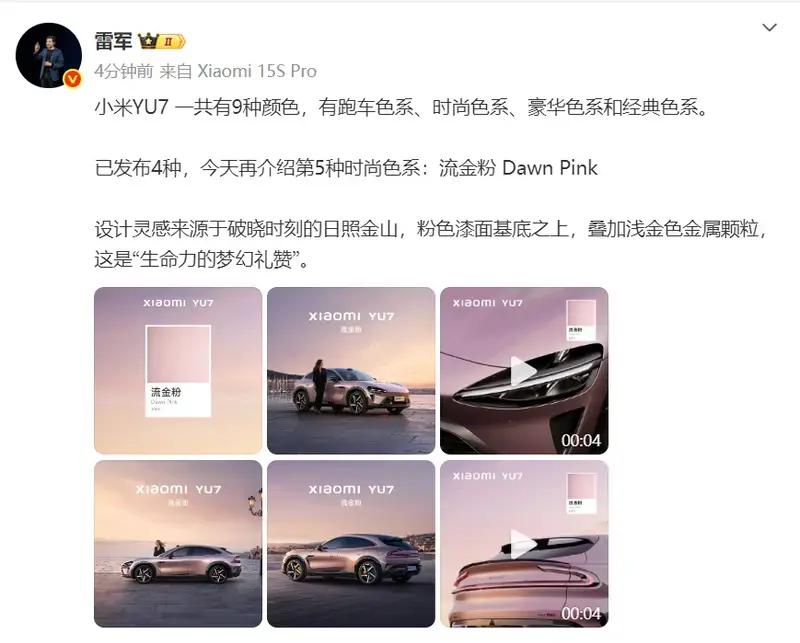 雷军在微博上表示,小米YU7一共有9种颜色,有跑车色系、时尚色系、豪华色系和经典色系。今天再介绍第5种时尚色系:流金粉 Dawn Pink。
