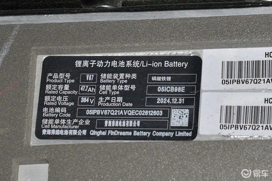 这辆车配有一块磷酸铁锂电池,供应商是比亚迪自己的弗迪。额定容量47.7安时,电压是384伏。这块电池没有水路散热或加温,依旧采用空调直冷散热和电阻丝加热,优点就是便宜,缺点是温度控制不如水冷均匀,并且几乎无法维修。
