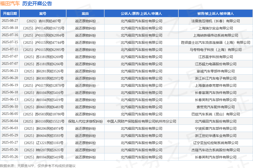 案号:(2025)沪0115民初62995号根据统计,近一年内以北汽福田汽车股份有限公司为当事人的历史开庭公告有59则,其中案由为“返还原物纠纷”的公告以30则居首,其次为“买卖合同纠纷”有9则,“产品责任纠纷”有5则。历史开庭公告(前20条)如下: