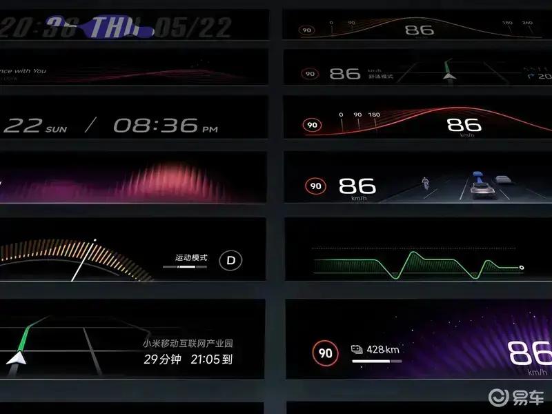 值得一提的是,新车首发搭载小米天际屏全景显示(Xiaomi HyperVision),小米天际屏全景显示不仅突破了传统车内显示器的局限,还为驾驶员提供了一种全新的视觉体验,使得内部空间显得更加科技感十足。此屏幕可以显示续航、速度、多媒体、导航等信息。官方表示,全景曲面投影技术由三块Mini LED屏幕,将信息直接反射到前风挡下黑区,拥有1.1m超宽全景显示。