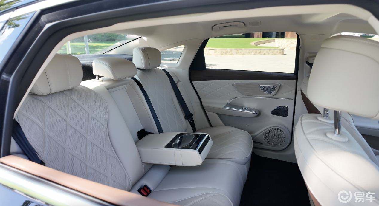 内饰设计非常成功,有迈巴赫的质感,车顶是织物,车门是木质+仿皮包裹,主副驾前双拼色的设计很高级,属于简约不简单很上档次的设计,好评。
