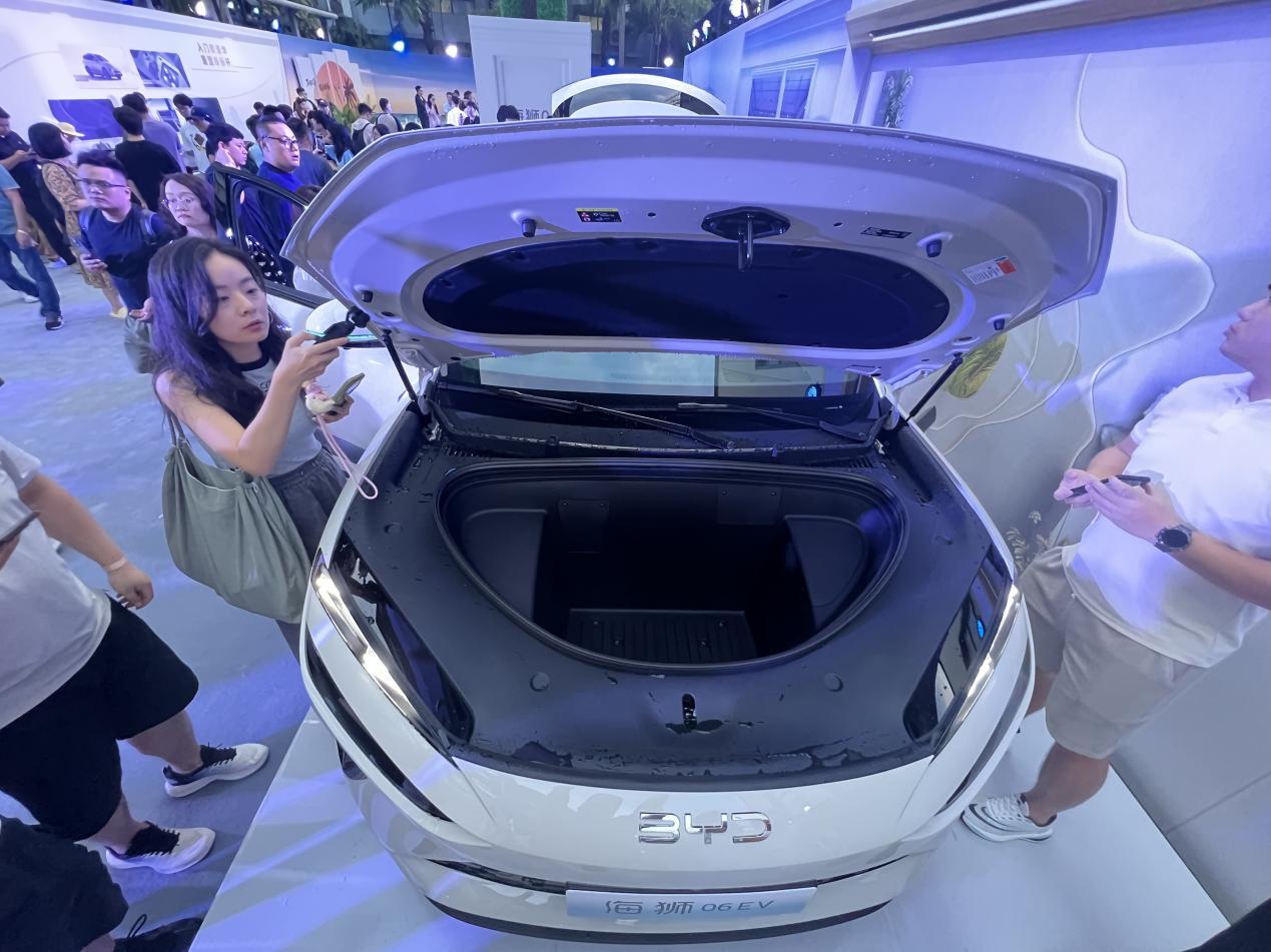 另外如果有出行制冷加热饮品需求,可以选择顶配。冷暖冰箱和丹拿音响都是顶配车型独享,此外EV版还有一个142L的前备箱,而DM-i版因为要放发动机,这个前备箱是没有的。