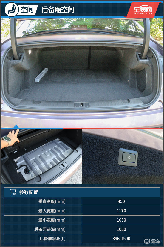 打开后备厢,在后排座椅正常使用的情况下,容积为396L,摆放4-5个登机箱不成问题;将座椅比例放倒后,容积可扩展至1500L,装载能力得到进一步提升。此外,由于后备厢底部配有电动机等机械部件,所以并没有多余的空间来设置下沉式的储物槽。