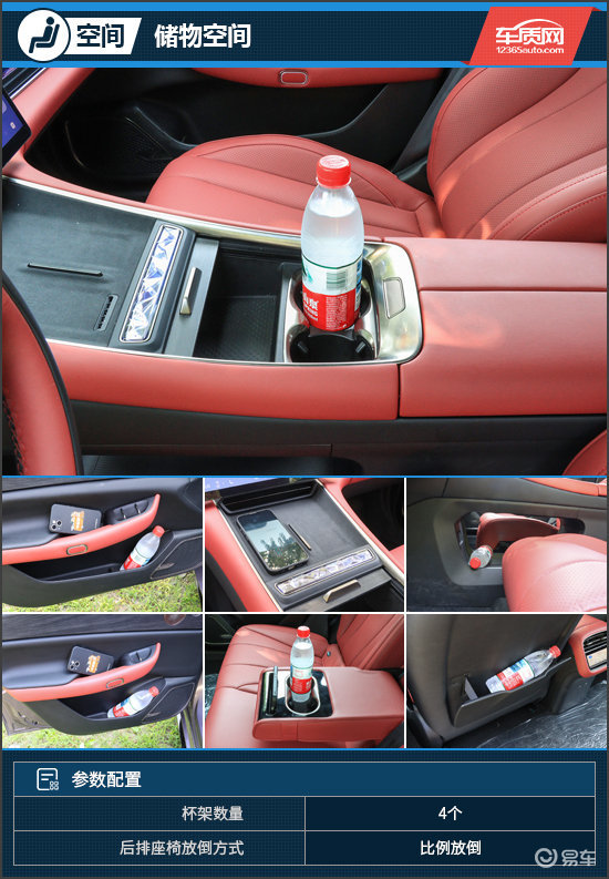 储物空间数量比较丰富,前排中控屏的下方有两个手机槽,左侧支持50W手机无线充电,并带有散热口。打开后方盖板,内部设置了一个储物槽和两个带限位器的水杯架,实用性表现不错。另外,中央通道的下方采用掏空处理,能够容纳较大体积的物品。