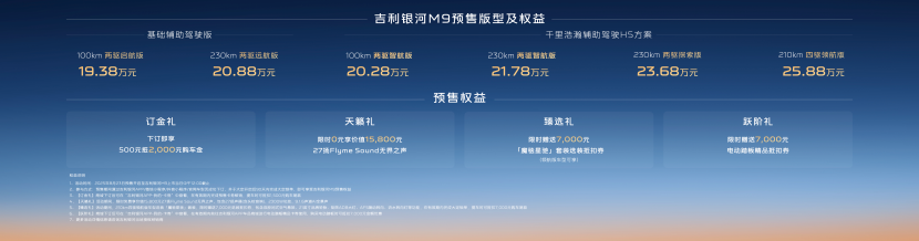 8月23日,吉利银河旗下首款“AI科技大六座旗舰SUV”——吉利银河M9正式开启全球预售,共推出6个版型,分别为210km四驱领航版、230km两驱探索版、230km两驱智航版、100km两驱智航版、以及230km两驱远航版、100km两驱启航版。预售价格为19.38万元——25.88万元。