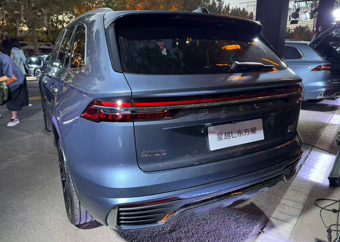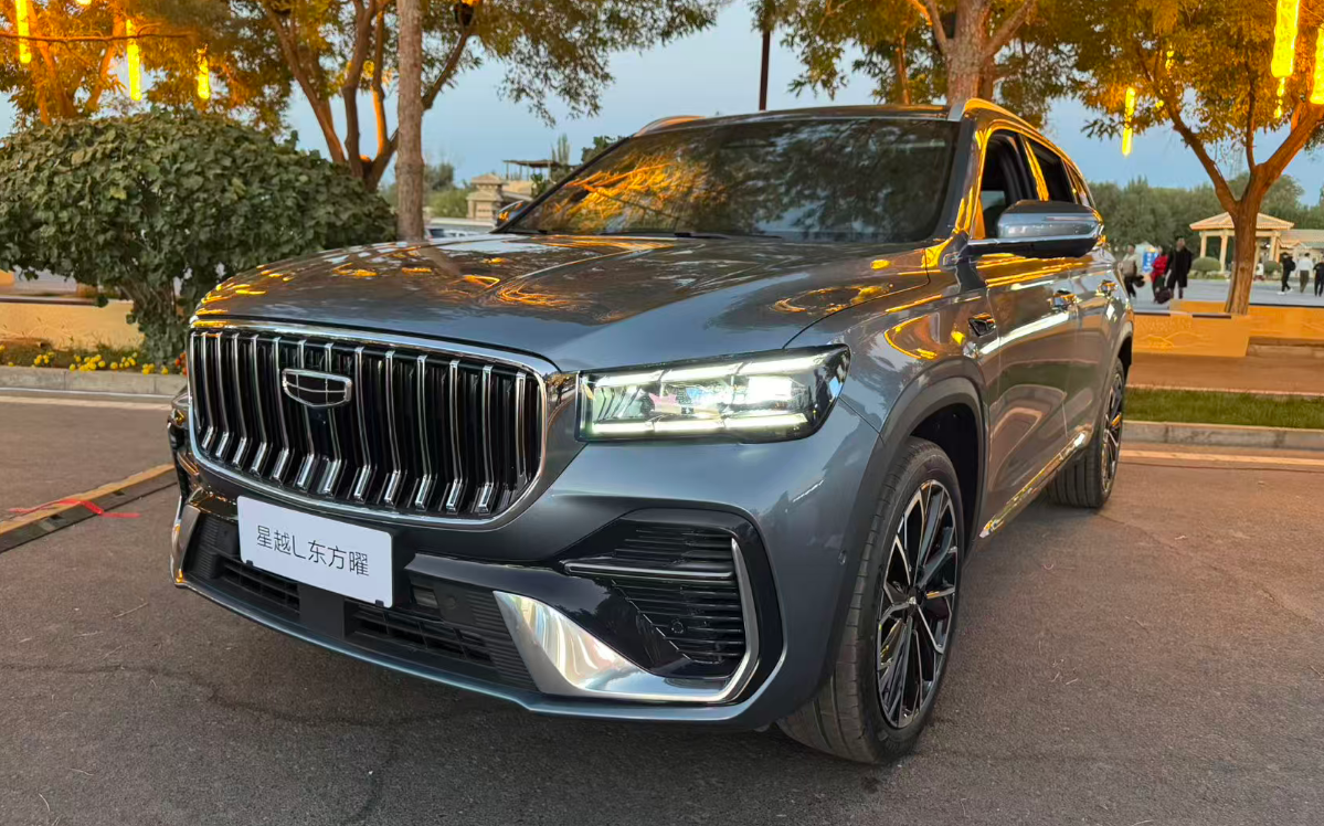 侧面,依旧给人踏实的厚重感,腰线恰到好处的将侧面完美支撑,车门下方的镀铬饰条也适度的点缀,再配合花瓣式的密幅轮圈,让新款星越L东方曜在路上的辨识度更高。
