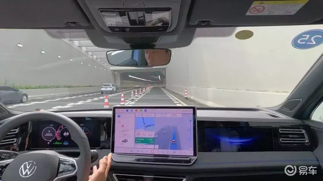 一个有趣的例子是,当车辆进入隧道后,原车道变成了左侧虚线,意味着允许超车,但又因为有桩桶存在,变道无法实现。在这样的“纠结”情况下,车辆的行驶依然非常平稳,没有出现不规则的加减速或忽左忽右的现象,这表明系统的整体逻辑是合理的,优先保障当前的安全行驶。
