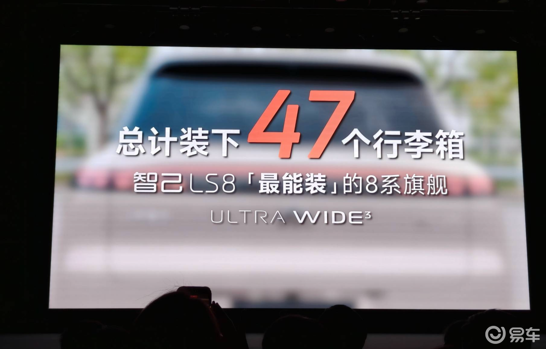 介绍完乘员的可利用空间后,零碎物件、行李的装载空间也同样被中国消费者看重。针对这些需求,智己 LS8 宣称全车最多可装下 47 个行李箱(折叠除主驾外的所有座椅),正常状态下也能装下 6 个 28 英寸行李箱,「比同尺寸 SUV 多 2 个」。