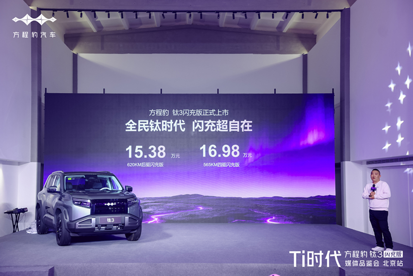 3月,比亚迪方程豹钛3闪充版已正式上市,推出620公里后驱闪充版与565公里四驱闪充版两款车型,官方指导价分别为15.38万元、16.98万元。新车首搭比亚迪颠覆性闪充技术,现场实测闪充性能惊艳,以极致补能速度打破纯电出行补能焦虑,加之越级配置与亲民定价,成为A级纯电市场高价值之选。