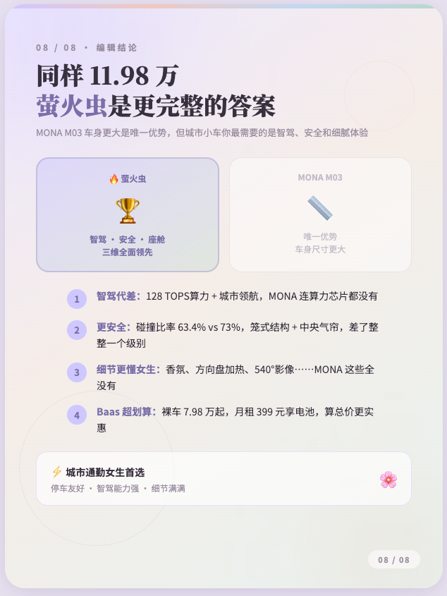 - 谁最省钱:萤火虫百公里电耗更低,月均电费比小鹏省 3 块钱,BaaS 方案还能降低购车门槛,长期用更划算。