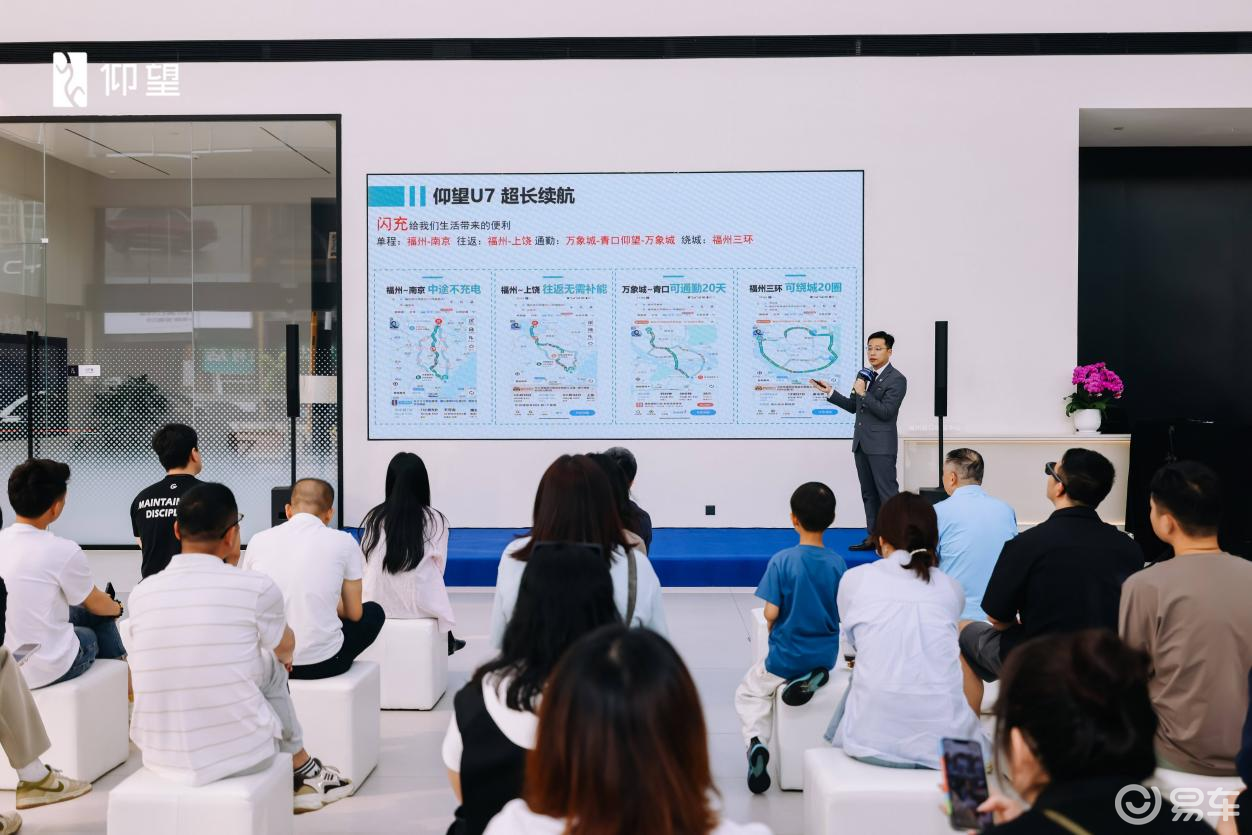 活动现场,仰望U7闪充版成为全场焦点。凭借高达1006公里的纯电续航能力(CLTC工况),U7不仅轻松覆盖日常通勤,更让长途出行彻底告别补能焦虑:从福州到南京,全程896公里,无需补能;福州至上饶往返近900公里,同样一电直达;若在福州三环环绕,可连续行驶20圈而无需充电。而对于每天往返福州万象城与青口仰望中心的通勤场景(来回约50公里),一次充电即可满足20天日常通勤。现场展示的车辆(车牌号:闽A·FB5519、闽A·F08929)与续航路线图,让来宾直观感受到——闪充版U7,让“远行无忧,通勤从容”成为现实。